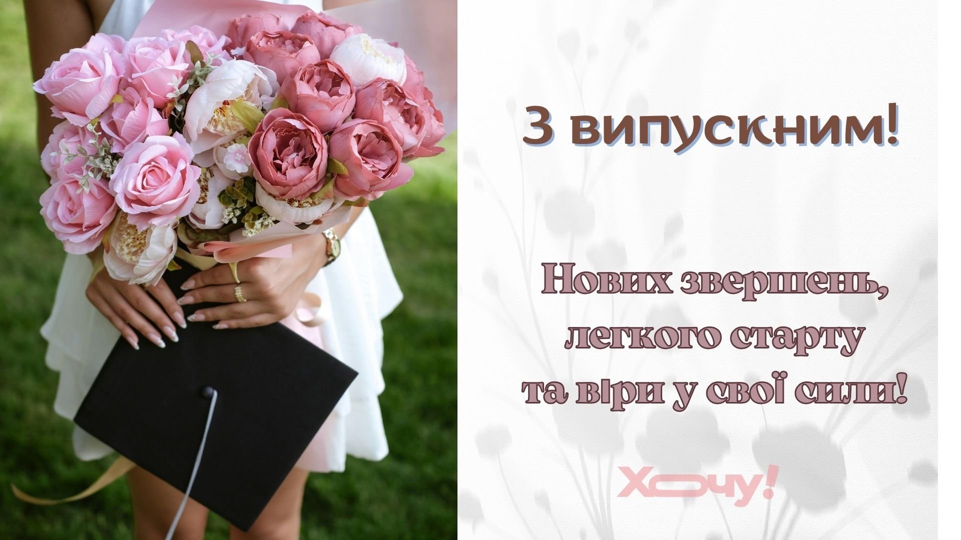 Хочу! вітає випускників 9 класу з важливою подією життя і серйозним кроком в доросле життя. У випускний ми бажаємо впевнених сил і високих цілей, підтримки рідних і міцної любові, доброї вдачі та яскравого світла на шляху, гарних ідей і блискучих успіхів, вірних друзів і щастя без жодної перешкоди.