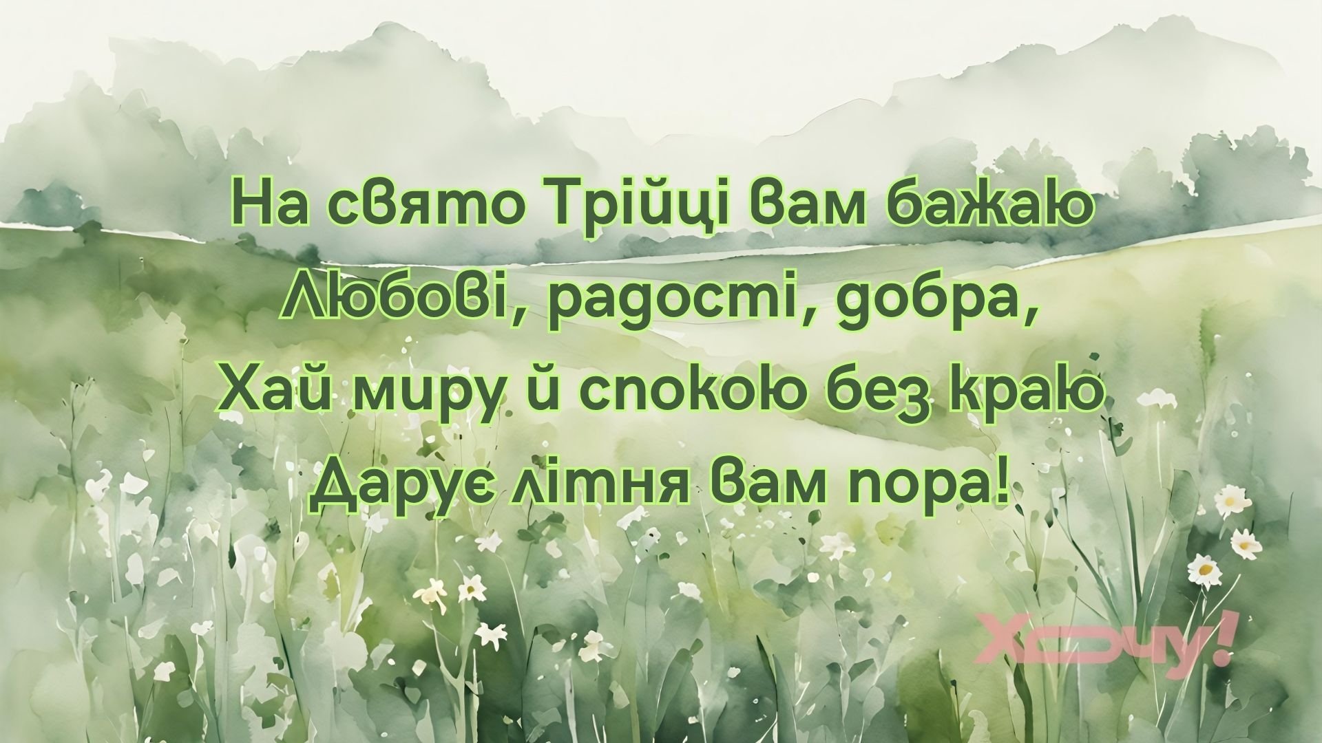 В цей світлий день Трійці хочу побажати вам щастя, здоров'я та достатку. Нехай любов Божа заповнить ваші серця, а благословення впливатимуть на кожен аспект вашого життя. Хай це свято стане початком нових можливостей і радісних змін. Вітаю з Трійцею!