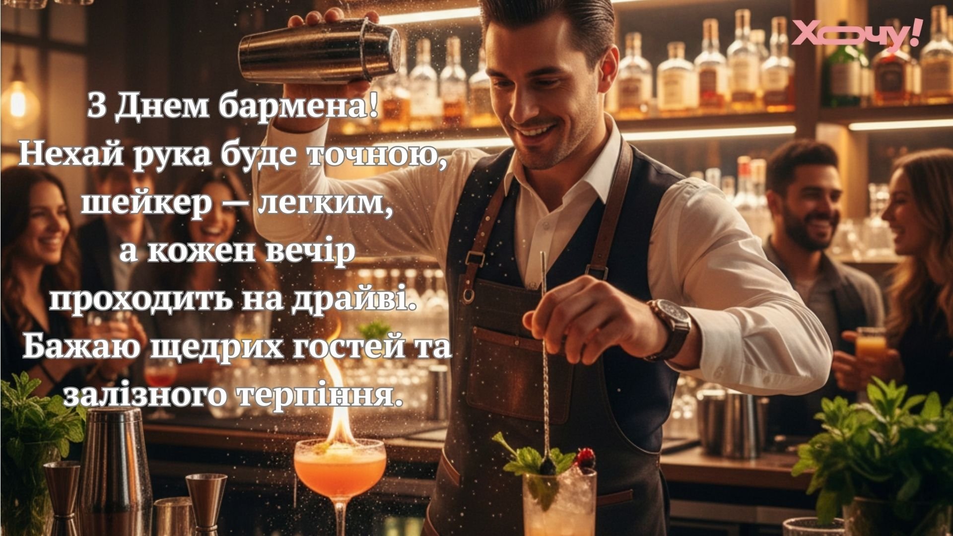 Вітаю зі святом головного алхіміка за стійкою! Бажаю залізного терпіння, ідеального таймінгу та вдячних гостей. Нехай твій бар завжди буде місцем сили, а кожен налитий келих приносить задоволення і тобі, і клієнту. Cheers!