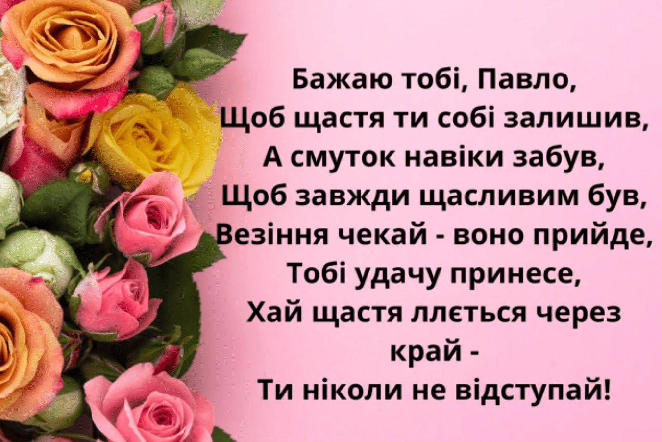 Павлику, вітаємо тебе з іменинами! Нехай у твоєму житті завжди світить сонце, а на шляху зустрічаються тільки добрі та щирі люди. Бажаємо тобі натхнення у всіх починаннях, удачі в справах та любові, яка зігріває серце. Нехай ангел-охоронець завжди оберігає тебе і дарує щастя!