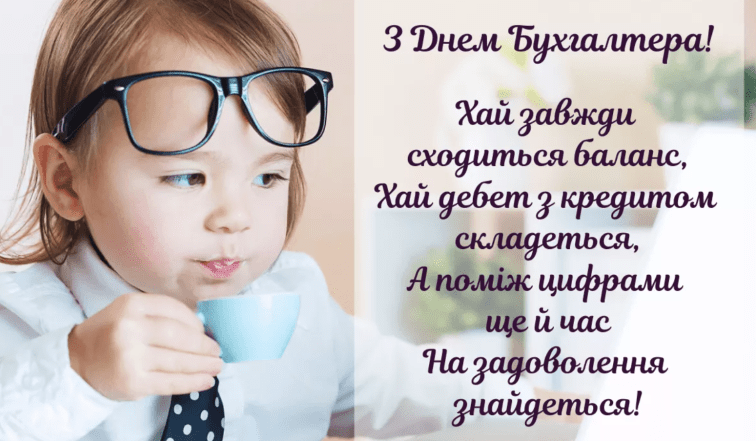 Нема на світі точнішої професії, ніж бухгалтер! Вітаю вас, моїх дорогих і ненаглядних — красивих і мудрих, прекрасних і улюблених — наших славних бухгалтерів! Бажаю вам краси неземної, романтичної любові, дитячого сміху і сліз радості, поваги та шани, точності та швидкості в роботі, вдалих буднів і веселих свят зі своїми близькими та рідними людьми!