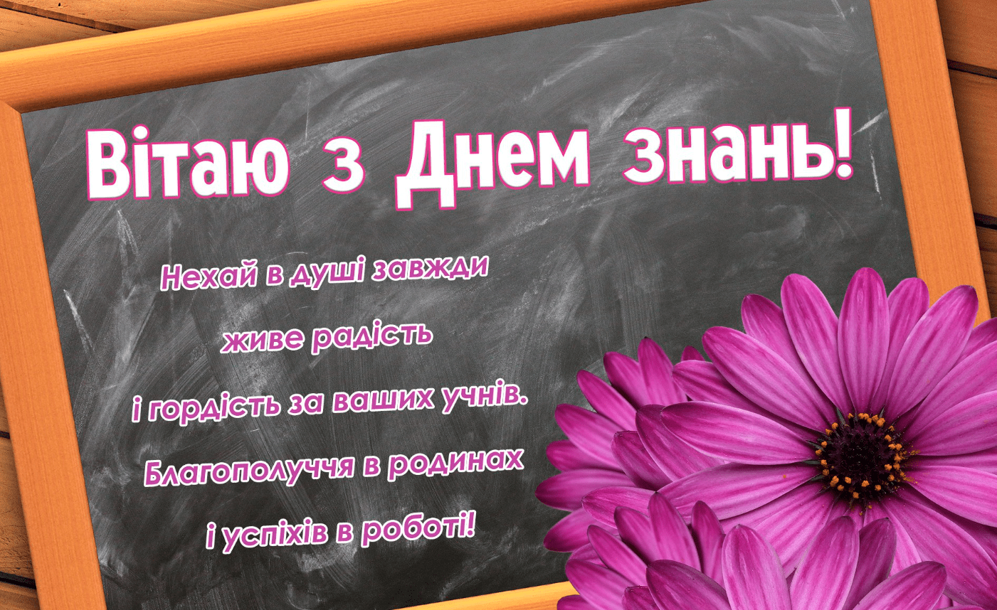 Вітаю з Днем знань! Бажаю величезного бажання вчитися та здобувати нові знання. Легкого навчального року вам, дружної атмосфери, цікавих подій, чудових оцінок і постійного прагнення бути кращим, ніж учора. Успіхів, удачі, здоров'я, терплячості й чудових результатів!