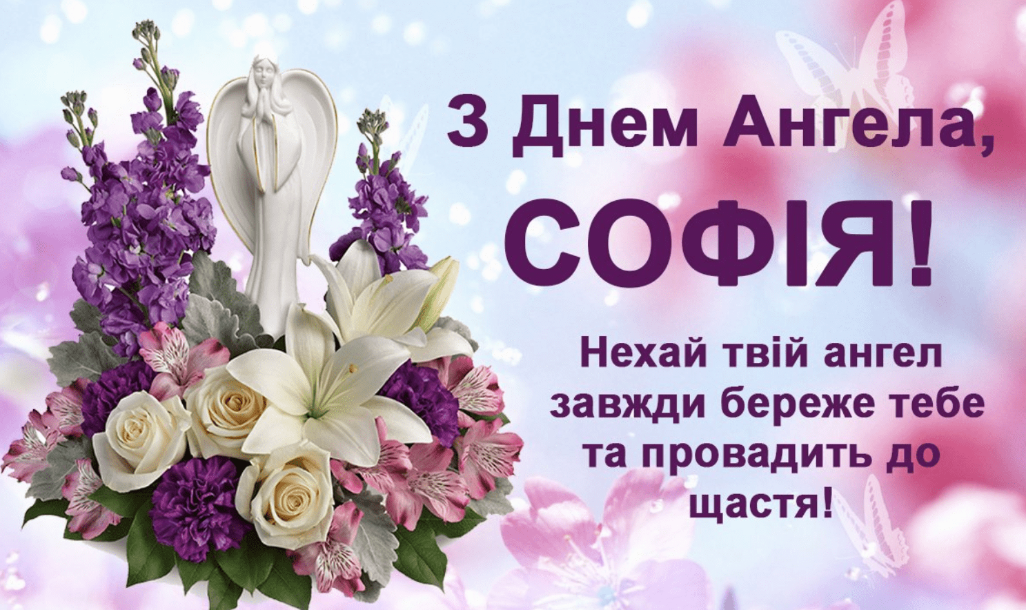 Вітаю з Днем ангела, дорога Софіє! Нехай твій небесний охоронець буде завжди з тобою поруч — і у хвилини радості, і у хвилини смутку, і в любові, і розлуці. Нехай він укріплює твою віру і сповнює тебе надією! Коли ти впадеш, він — підніме, коли ти заплачеш — втішить, коли ти втомишся — він додасть тобі сил. Йди по життю з вірою — і щастя неодмінно зустріне тебе на шляху!