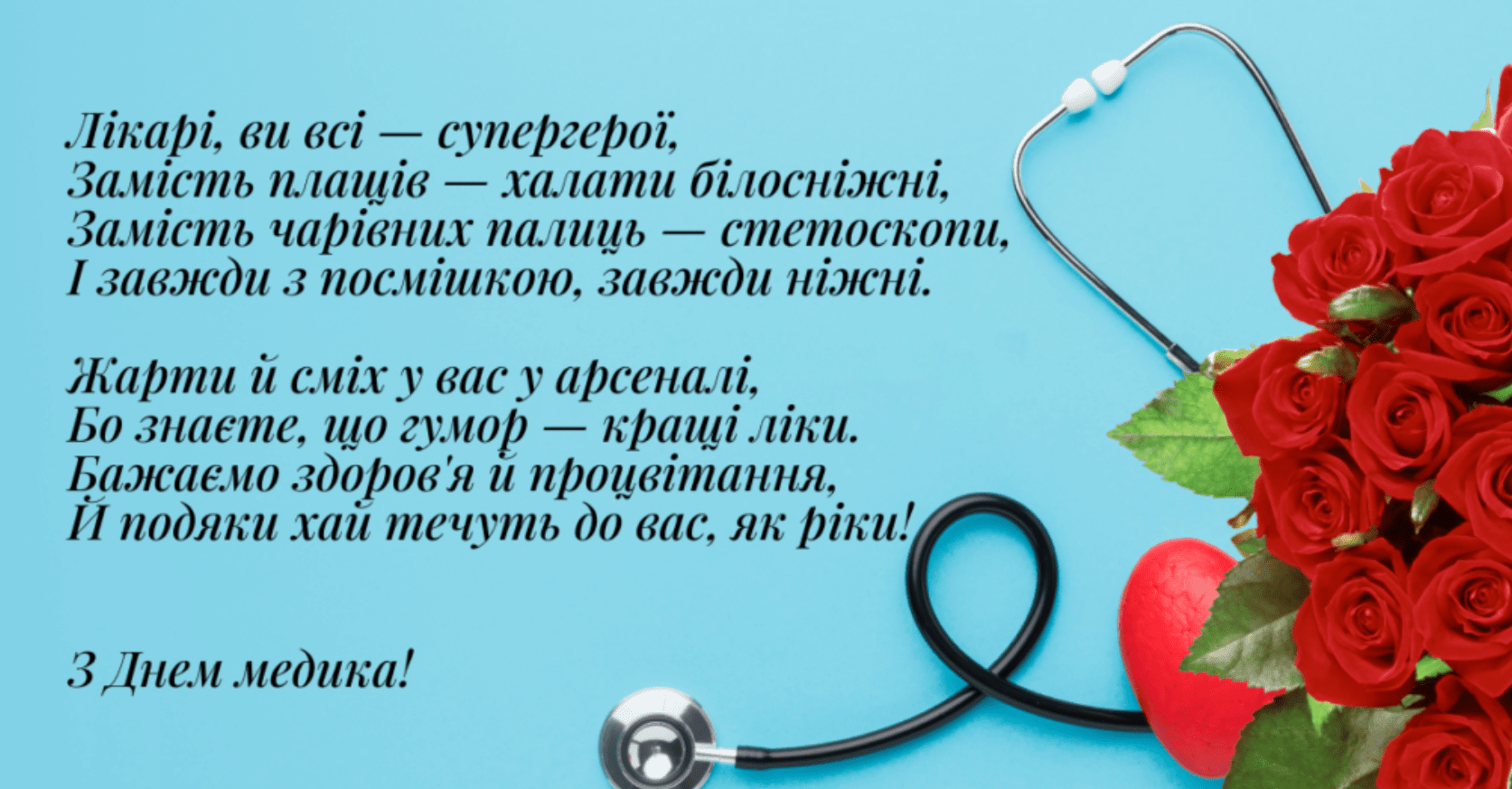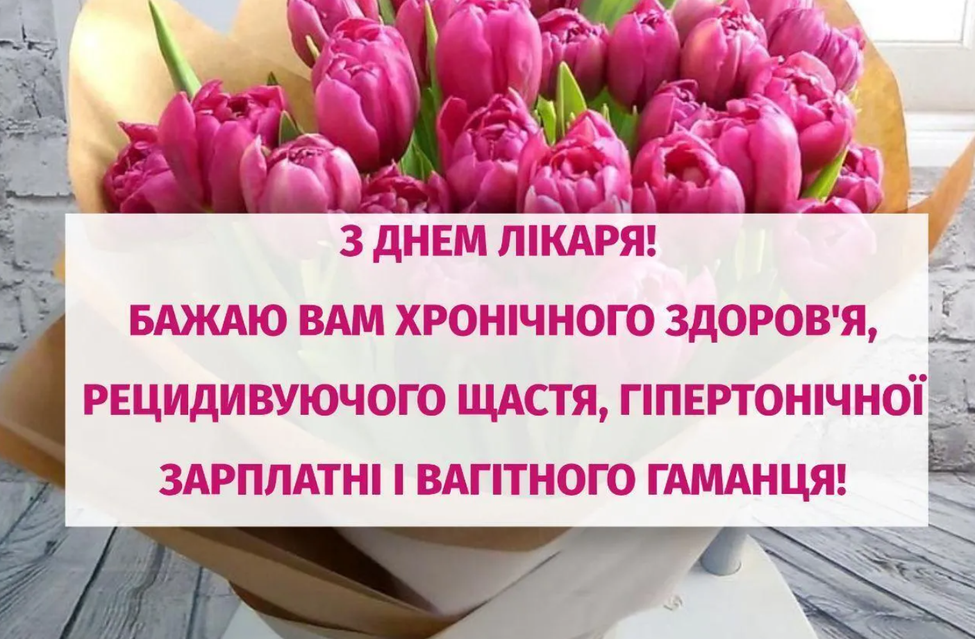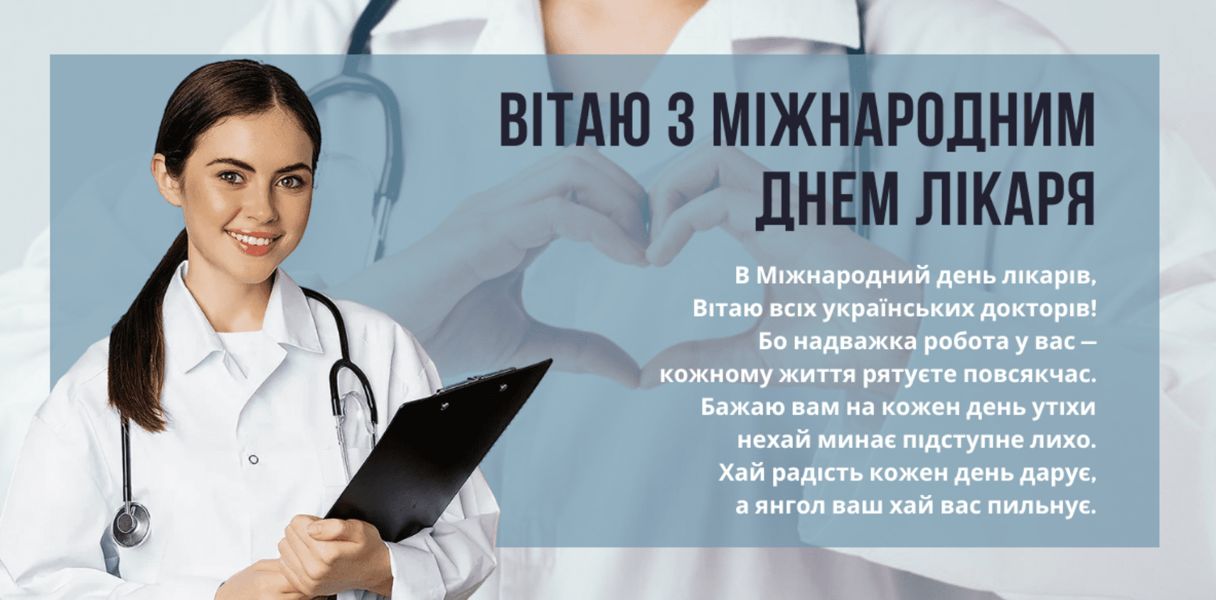 З Міжнародним днем лікаря! Ви — ті, хто лікує не лише фізичні недуги, а й душевні рани. Нехай ваші зусилля приносять плоди, а ваша праця буде визнана та високо оцінена. Бажаю вам здоров'я, удачі та багато вдячних пацієнтів!