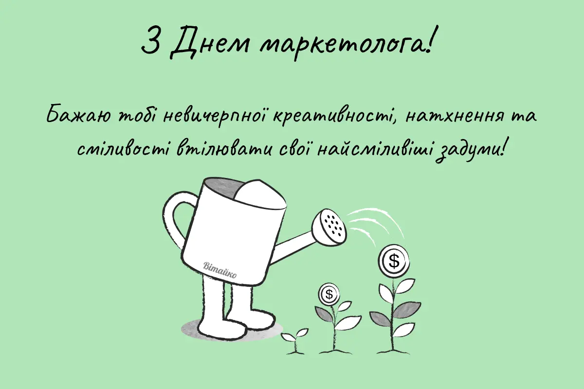 Вітаю з Днем маркетолога! Хочу побажати тобі цікавих, стабільних проєктів, безліч можливостей для розвитку та інноваційних рішень! Щоб у твоєму житті було багато цікавих планів та креативних кейсів! Зі святом!