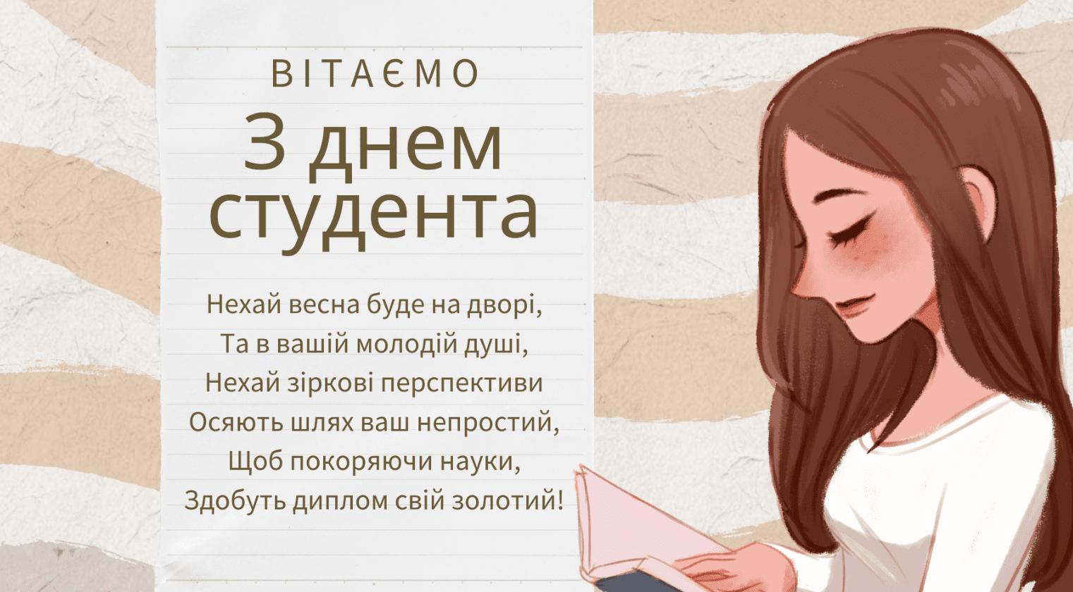 Від душі вітаю з Міжнародним днем студентів. Бажаю яскравих моментів у житті, великих перемог, гідних досягнень, веселих пригод, щасливих зустрічей та великих подорожей! Бажаю не втрачати інтересу до навчання. Бажаю кожен свій день робити плідним, чудовим та неперевершеним. Також бажаю кохання, натхнення та везіння.