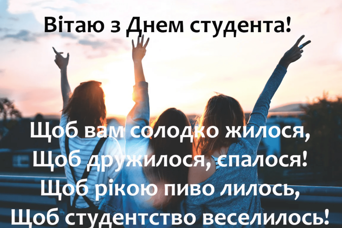 З Днем студента! Бажаю, щоб розклад лекцій не заважав щільному графіку студентських вечірок, щоб на парах солодко спалося, а залікова книжка рясніла п'ятірками.