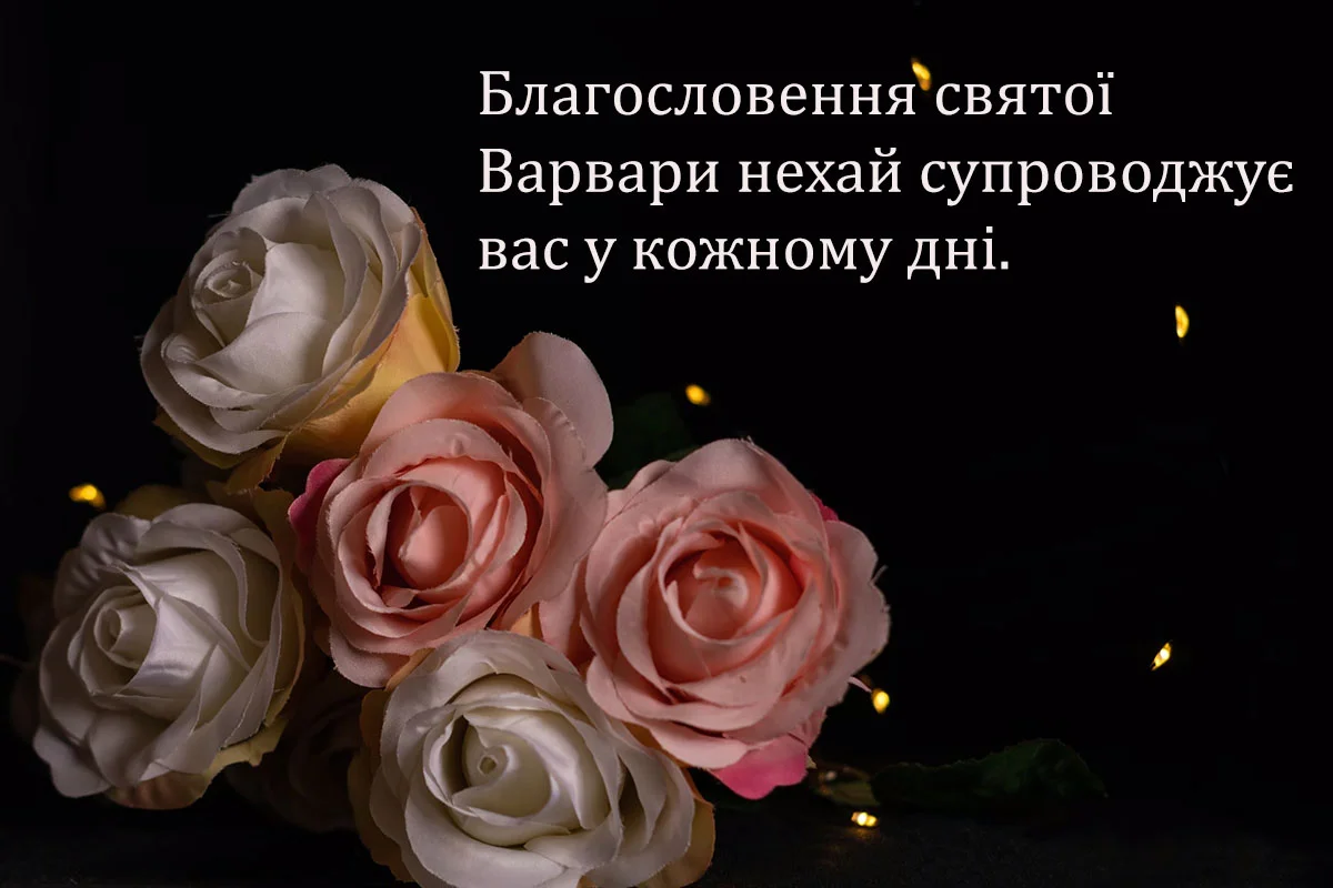 Нехай Свята Варвара, як покровителька жіночої долі, дарує Вам ніжність, жіночу мудрість і відчуття повного, щирого щастя. Бажаю, щоб Ваша душа розквітала радістю від кожного світанку, а мрії, що живуть у серці, обов'язково знайшли свій шлях до здійснення.