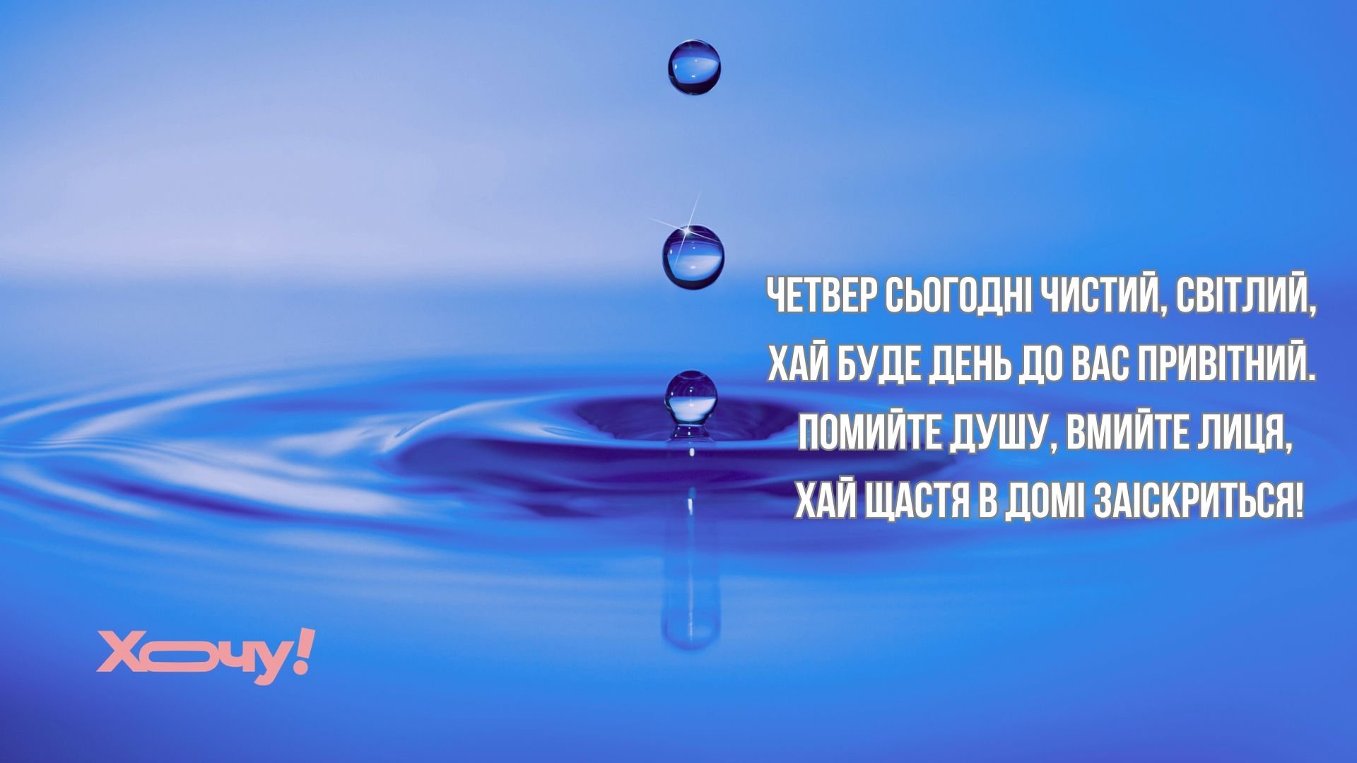Нехай в Чистий четвер вода змиє з тебе всі тривоги і печалі, нехай покинуть твій будинок всі біди і негаразди, нехай залишиться в душі світле щастя і радість, нехай позбудеться серце твоє смутку і образ, але не втратить віри у все хороше!