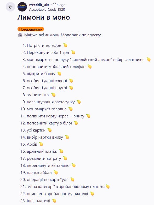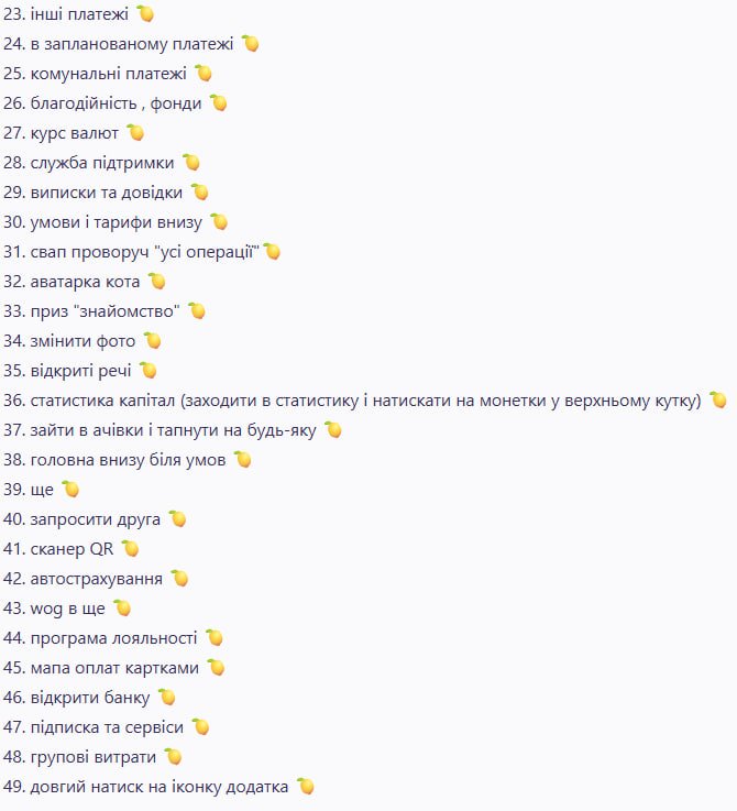 У Reddit та Telegram уже з’явилися списки з підказками, де користувачі діляться локаціями знайдених лимонів. Серед популярних місць - “Перекинути 1 грн”, “Поповнити мобільний”, “Архів платежів”, “Змінити ім’я”, “Статистика капітал”, “Мономаркет” і навіть довгий натиск на іконку застосунку на головному екрані.