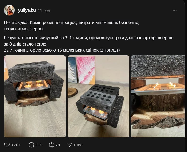 Другим популярним рішенням стали фото з квартир, де люди показують саморобні обігрівачі зі свічок і цегляних блоків з отворами. Такий камін працює як тепловий акумулятор і допомагає підвищити температуру в кімнаті без електрики, ідеєю поділилась користувачка “yuliya.ku” в threads.