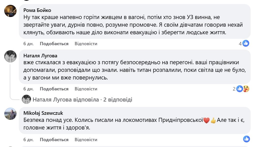 Хтось навпаки каже, що під час евакуації із потягів працівники УЗ дуже ввічливі та допомогають пасажирам, розповідають та намагаються зігріти. Адже, за словами людей, безпека - понад усе, особливо, коли бачиш новини, де люди гинуть у вагонах під час поїздок.