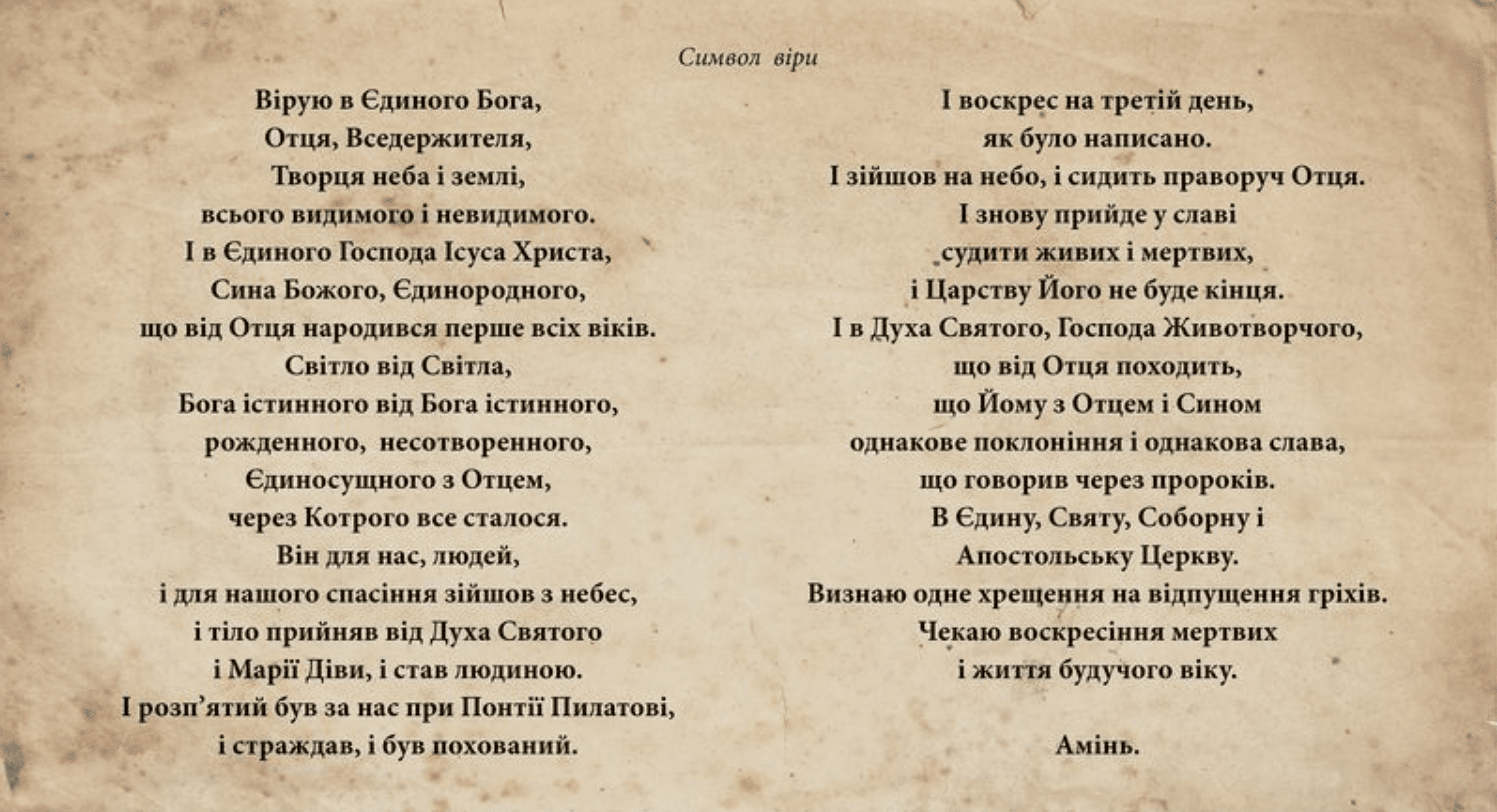 Вірую в Єдиного Бога, Отця, Вседержителя, Творця неба і землі, всього видимого і невидимого...І в Єдиного Господа Ісуса Христа, Сина Божого, Єдинородного, що від Отця народився перше всіх віків. Світло від Світла, Бога істинного від Бога істинного, рожденного. несотворенного. Єдиносущного з Отцем, що через Нього все сталося. Він для нас, людей, і для нашого спасіння зійшов з небес, і тіло прийняв від Духа Святого і Марії Діви, І став людиною. І розп'ятий був за нас при Понтії Пилаті, і страждав, і був похований. І воскрес на третій день, як було написано. І зійшов на небо і сидить праворуч Отця. І знову прийде у славі судити живих і мертвих, і Царству Його не буде кінця. І в Духа Святого, Господа Животворчого, що від Отця походить, що Йому з Отцем і Сином однакове поклоніння і однакова слава, що говорив через пророків. В Єдину, Святу, Соборну і Апостольську Церкву. Визнаю одне хрещення на відпущення гріхів. Чекаю воскресіння мертвих і життя будучого віку. Амінь.