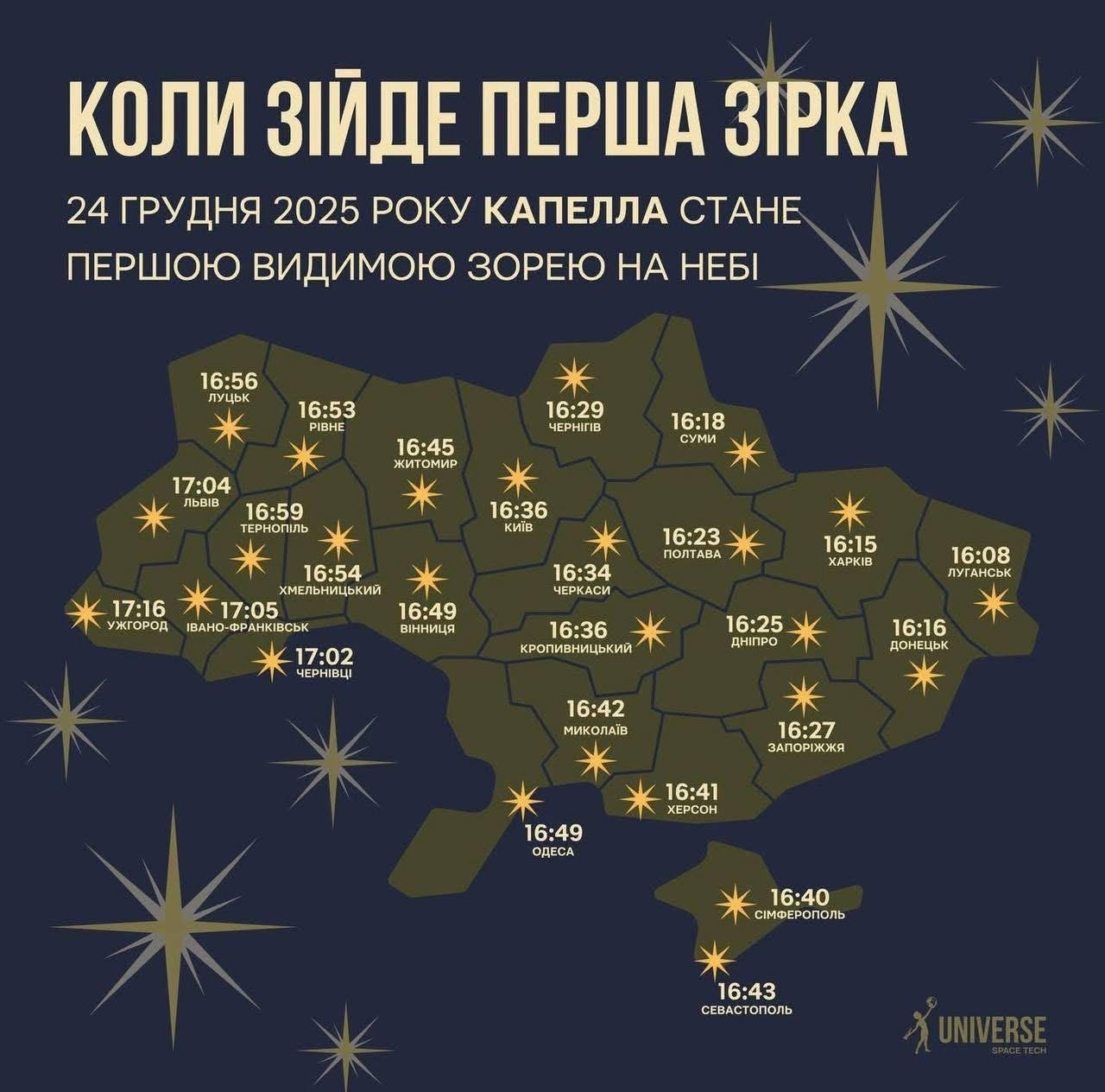 Кожне місто України має своє унікальне положення, тому і перша зірка десь зійде раніше, а десь — пізніше, пише “Universe Space Tech”. Згідно з Біблійною розповіддю, перша зоря зійшла саме в той момент, коли народився Ісус. Астрологи діляться, що 24 грудня 2025 року Капелла (перша Різдвяна зірка) стане видимою в небі України з 16:08.