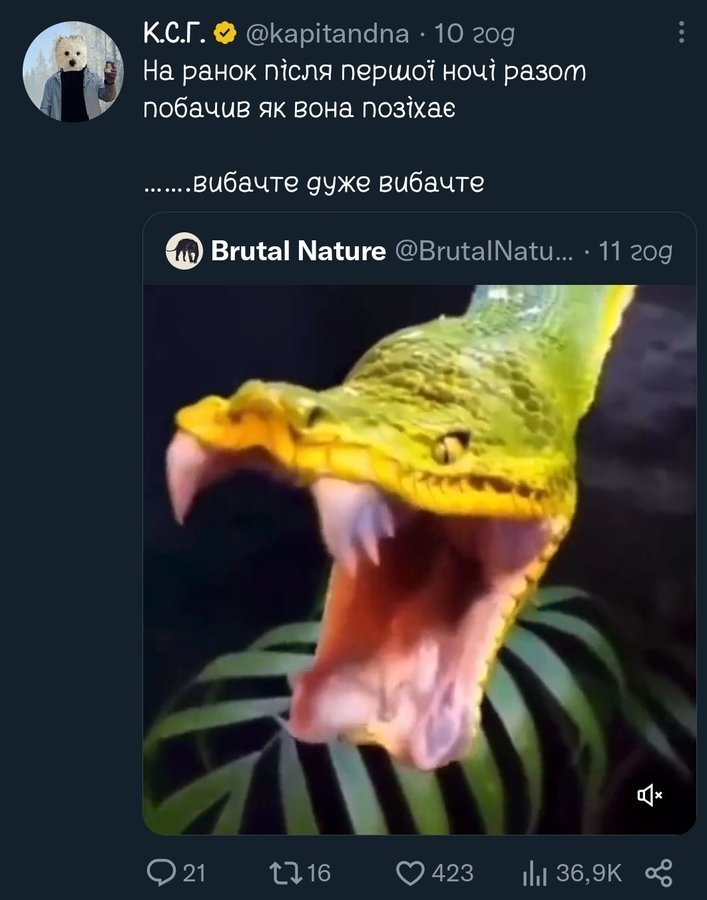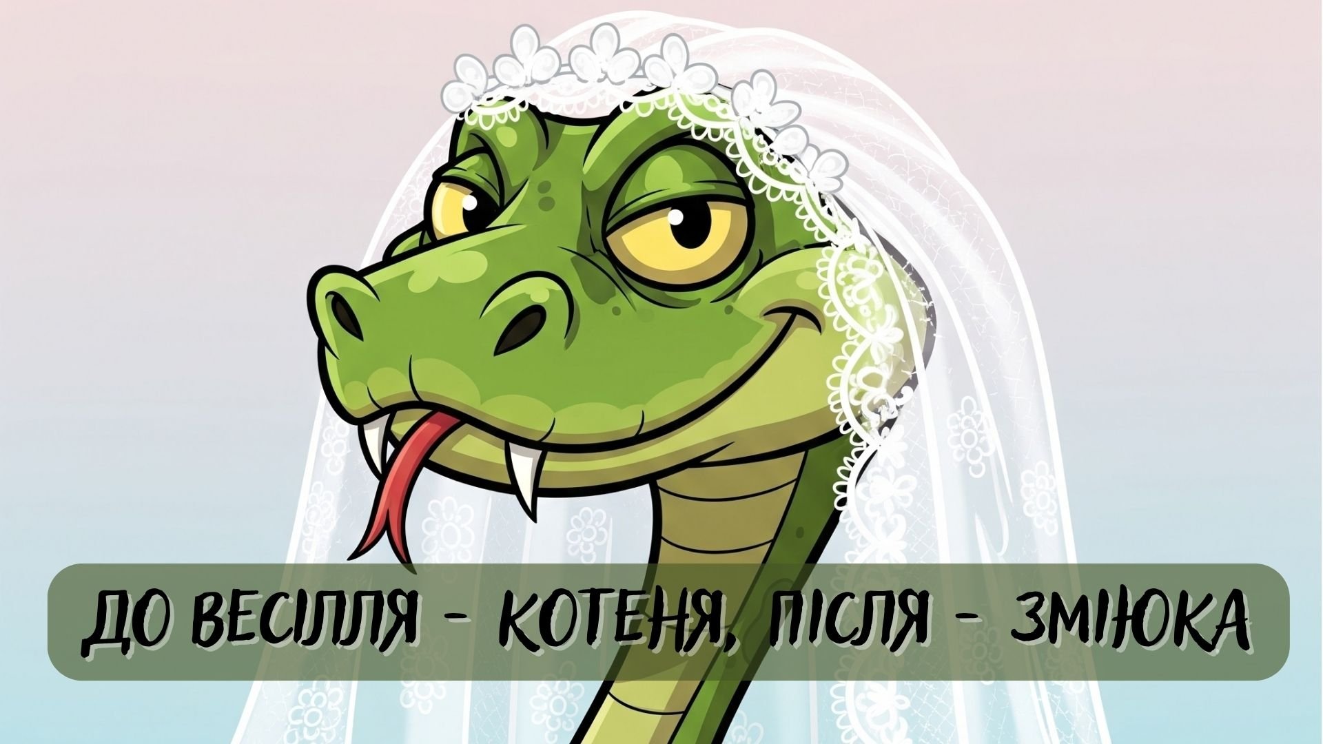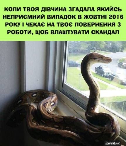 У народі чомусь саме жінок пов'язують зі зміями. Мовляв, вони шиплять, коли злі, кусають, плюються отрутою і здатні “проковтнути” кривдника. Ми зібрали кілька прикольних мемів та анекдотів про “жінок-змій”.