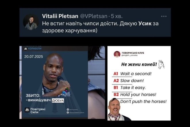 19 липня, в Лондоні на стадіоні “Вемблі” відбувся бій між Усиком та Дюбуа, який закінчився перемогою над молодим британцем. Мережа одразу наповнилася мемами та приколами про феєричний бій. До речі, перед боєм Усик разом з Пивоваровим записали потужний трек, який налаштовує на перемогу.