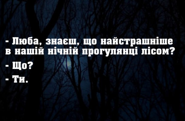 Лісник приходить додому з роботи: – Що сьогодні на обід, люба? – Вареники з м'ясом... – Із чиїм м'ясом? — підозріло запитує лісник. – Ти не турбуйся, у лісі все спокійно.