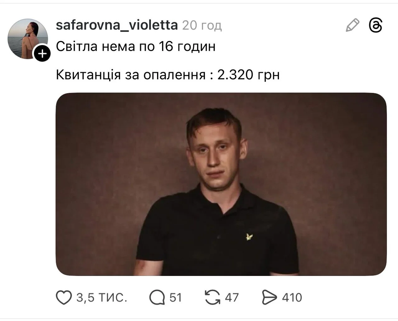 Шукаю хлопця з генератором та Starlink. Про себе: вмію готувати на сухому спирті та знаю 50 ігор у слова.