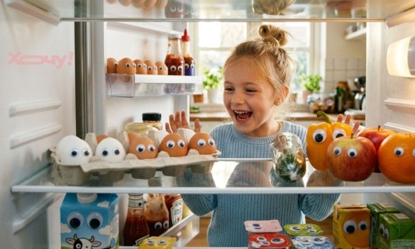 Купіть у магазині для творчості готові пластикові “очка” на клейкій основі (або просто виріжте з паперу). Наклейте їх на все в холодильнику: на яйця, пакет молока, яблука, йогурти. Коли дитина вранці відкриє холодильник, на неї дивитиметься ціла компанія “нових друзів”.