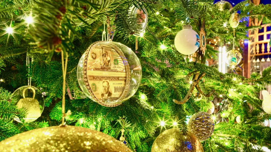 Серед прикрас можна побачити прикрасу у вигляді 24-каратної золотої купюри в 100 доларів, інкрустовану діамантами, страусині яйця, покриті сусальним золотом і алмазним пилом, флакони дорогих парфумів, мініатюрні сумочки та навіть фігурки лускунчиків, прикрашені коштовним камінням.