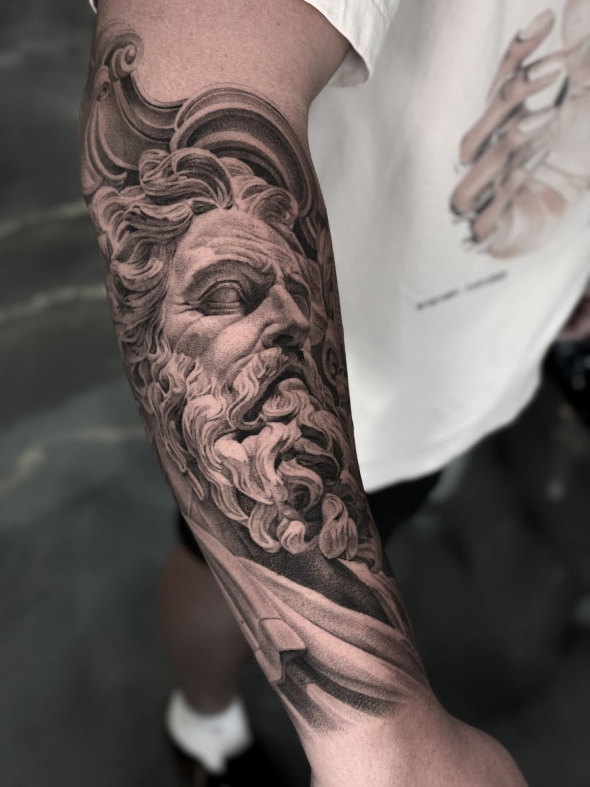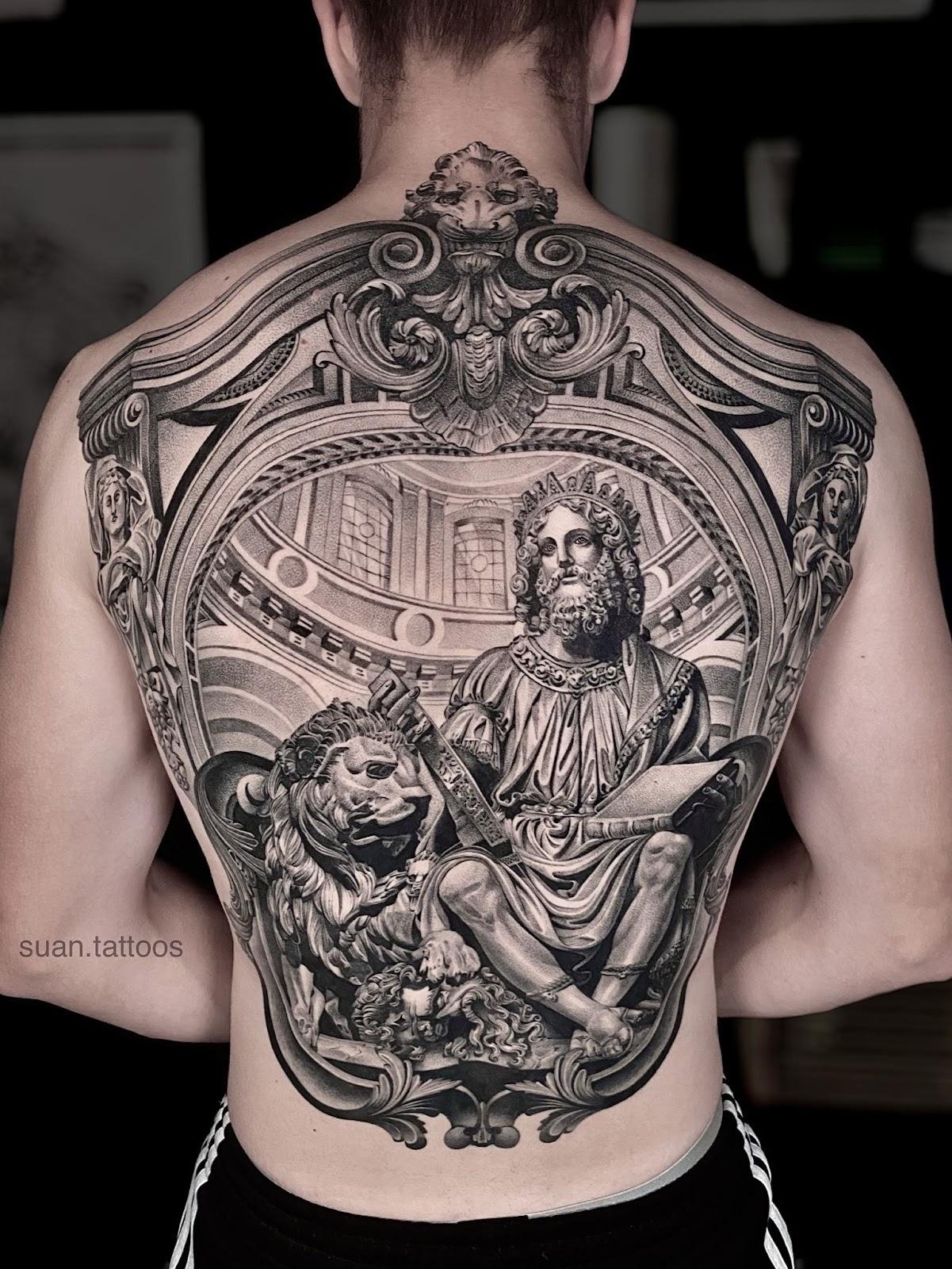 На конвенцію я готував масштабний проєкт — тату на всю спину: скульптура Давида з головою Голіафа, доповнені зображенням лева й архітектурного фону. Я створив детально пророблений дизайн. Ескіз вийшов потужним, глибоким і технічно складним. Я представив цю роботу в категорії «Загоєне тату у стилі графіка» й несподівано для себе здобув перше місце. Ось тоді мій світ перевернувся: я усвідомив, що мої роботи не лише подобаються людям, а й вражають суддів. Найсильніші майстри з різних країн визнали проєкт новачка найкращим у категорії!