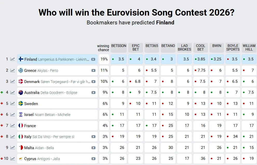 Оновлені прогнози вже з’явилися на профільних платформах, що відстежують ставки букмекерів. У трійці лідерів без змін залишилися Фінляндія та Греція, а ось Данія вирвалася на третю позицію.