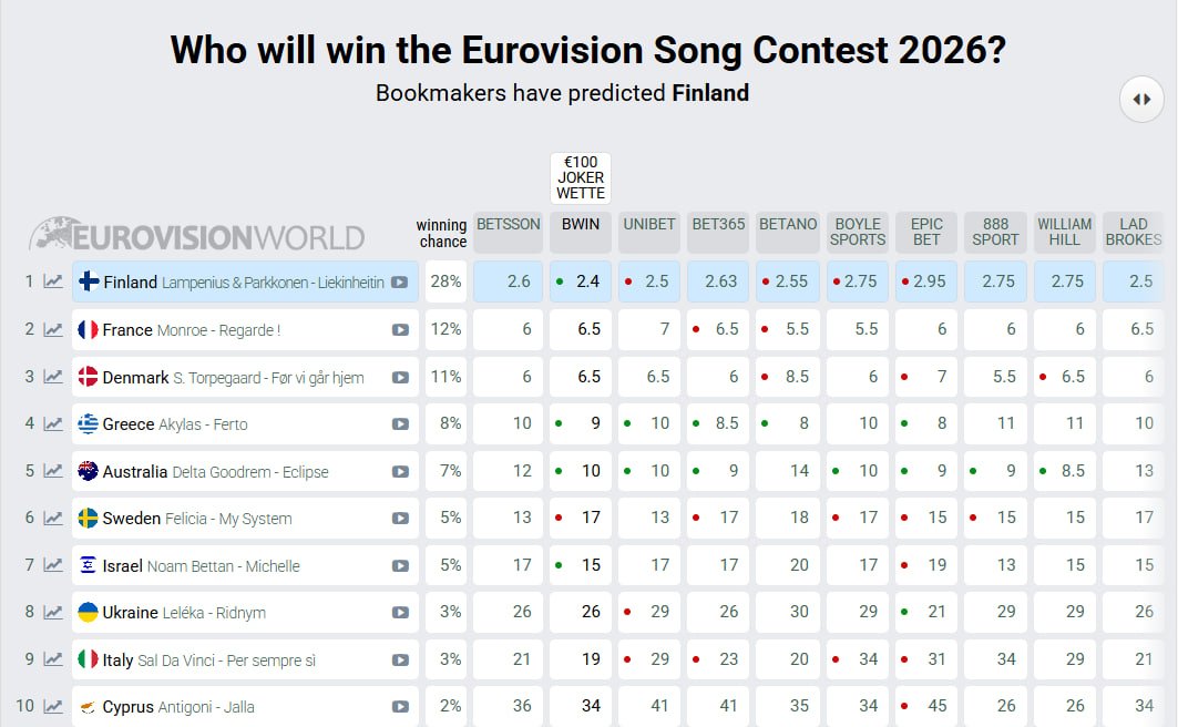 Але серед найближчих суперників України аналітики виділяють Італію та Кіпр — ці країни зараз посідають 9 й 8 місця в топі. Водночас загальна картина ще може суттєво змінитися, адже не раз траплялося, що учасники без статусу фаворитів можуть різко злетіти буквально за кілька днів до півфіналів після перших репетицій.