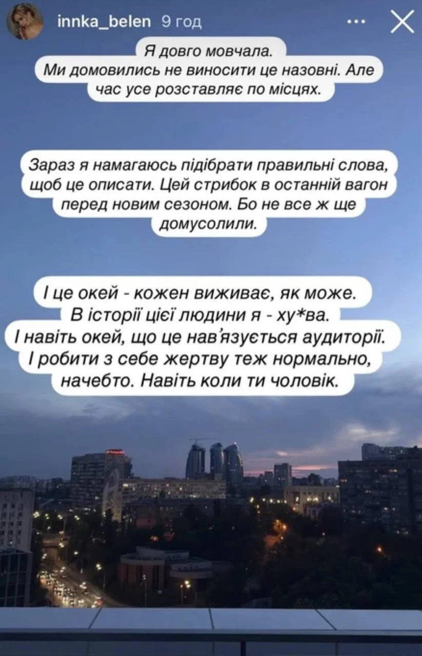 У сторіс Інна зізналася: мовчала довго, адже була домовленість — не виносити особисте на загал. Але Терен, схоже, вирішив інакше, коли прийшов на інтервʼю до Раміни та зізнався, що не хотів будувати стосунки з переможницею “Холостяка”.