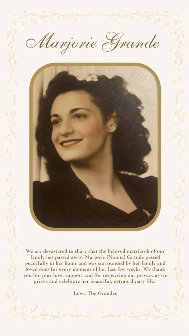Ми з болем у серці повідомляємо, що улюблена матріархиня нашої родини відійшла у вічність. Марджорі (Нонна) Гранде мирно померла у своєму домі, в оточенні родини та близьких, які були поруч з нею в кожну мить її останніх тижнів. Ми щиро дякуємо вам за вашу любов, підтримку та за повагу до нашої приватності в цей час скорботи та вшанування її прекрасного, неповторного життя,