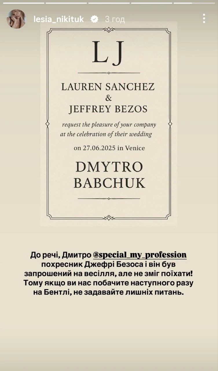 Жартівливе запрошення на весілля Безоса та Санчес для нареченого Лесі Нікітюк. Фото: instagram.com/lesia_nikituk
