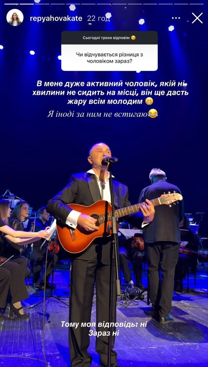 "У мене дуже активний чоловік, який ні хвилини не сидить на місці. Він ще дасть жару всім молодим. Я іноді за ним не встигаю. Тому моя відповідь — ні, зараз ні", — зазначила Репяхова.