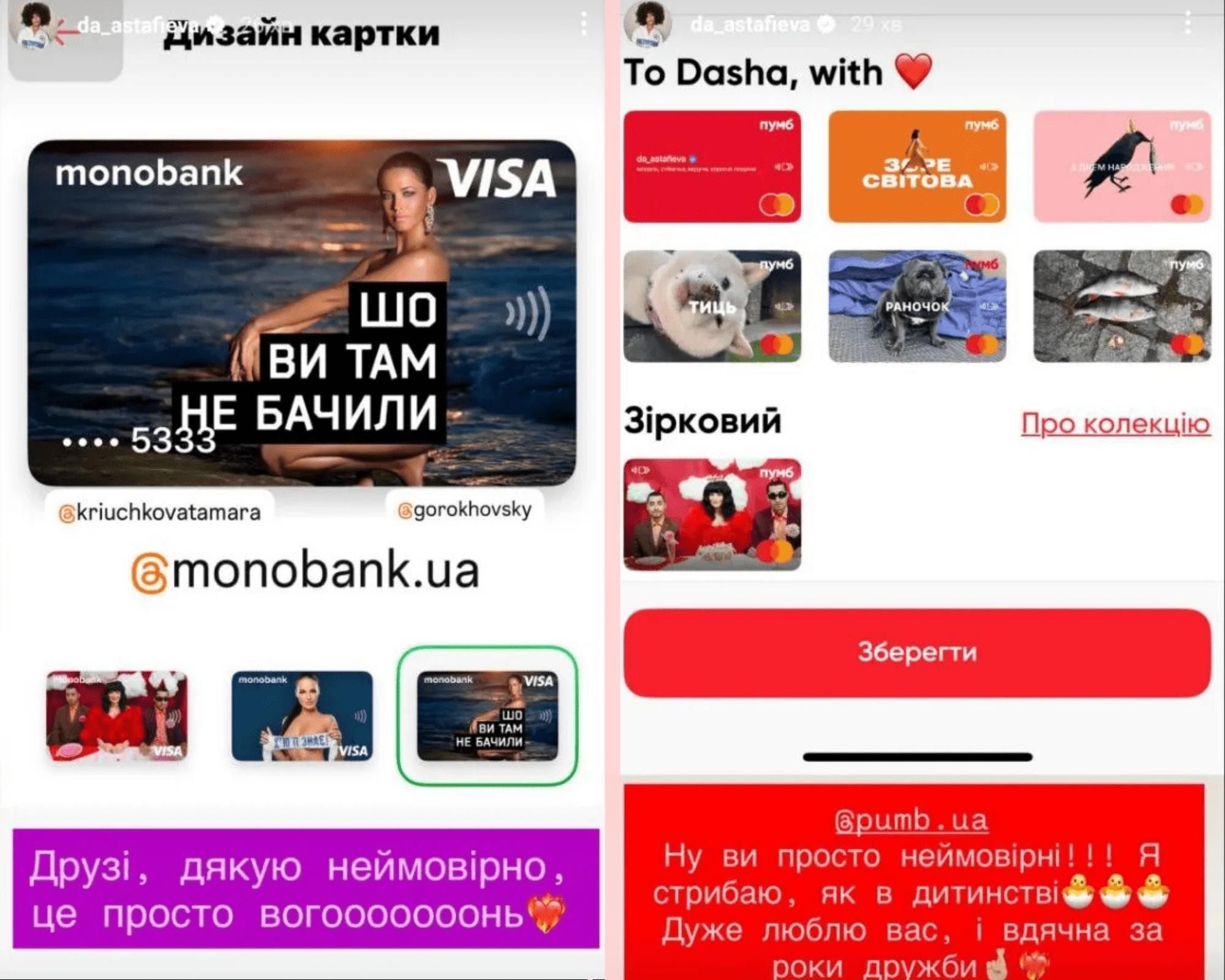 Даша Астафʼєва на картках Моно та Пумб