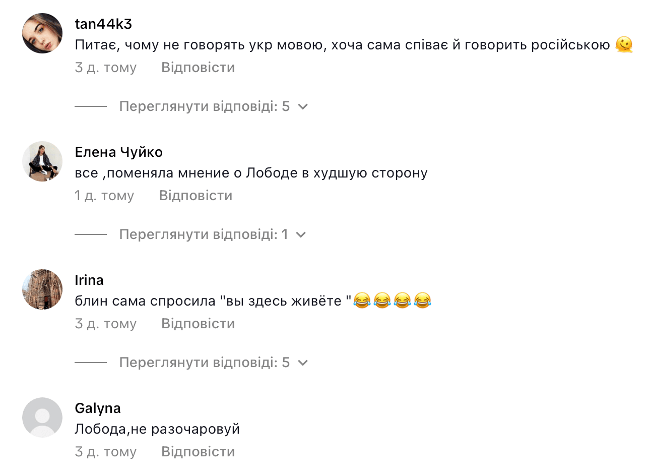 Користувачі ТікТок, де й зʼявилося відео зустрічі, швидко нагадали, що сама Лобода здебільшого говорить і співає російською. Ба більше, свої хіти вона продовжує співати російською на концертах. Тож у фанів виникло логічне питання: як можна дорікати дітям-переселенцям, якщо артистка сама не подає приклад?