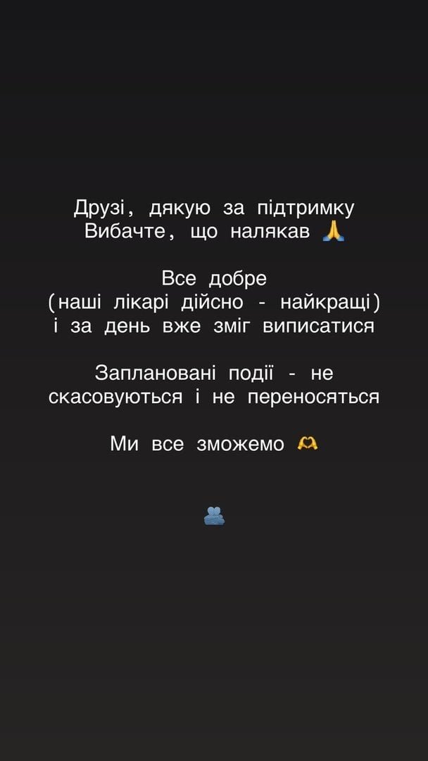 Дякую за підтримку! Прошу вибачення, що налякав. Все добре! Наші лікарі дійсно найкращі, і за день вже зміг виписатися. Заплановані події не скасовуються і не переносяться. Ми все зможемо,