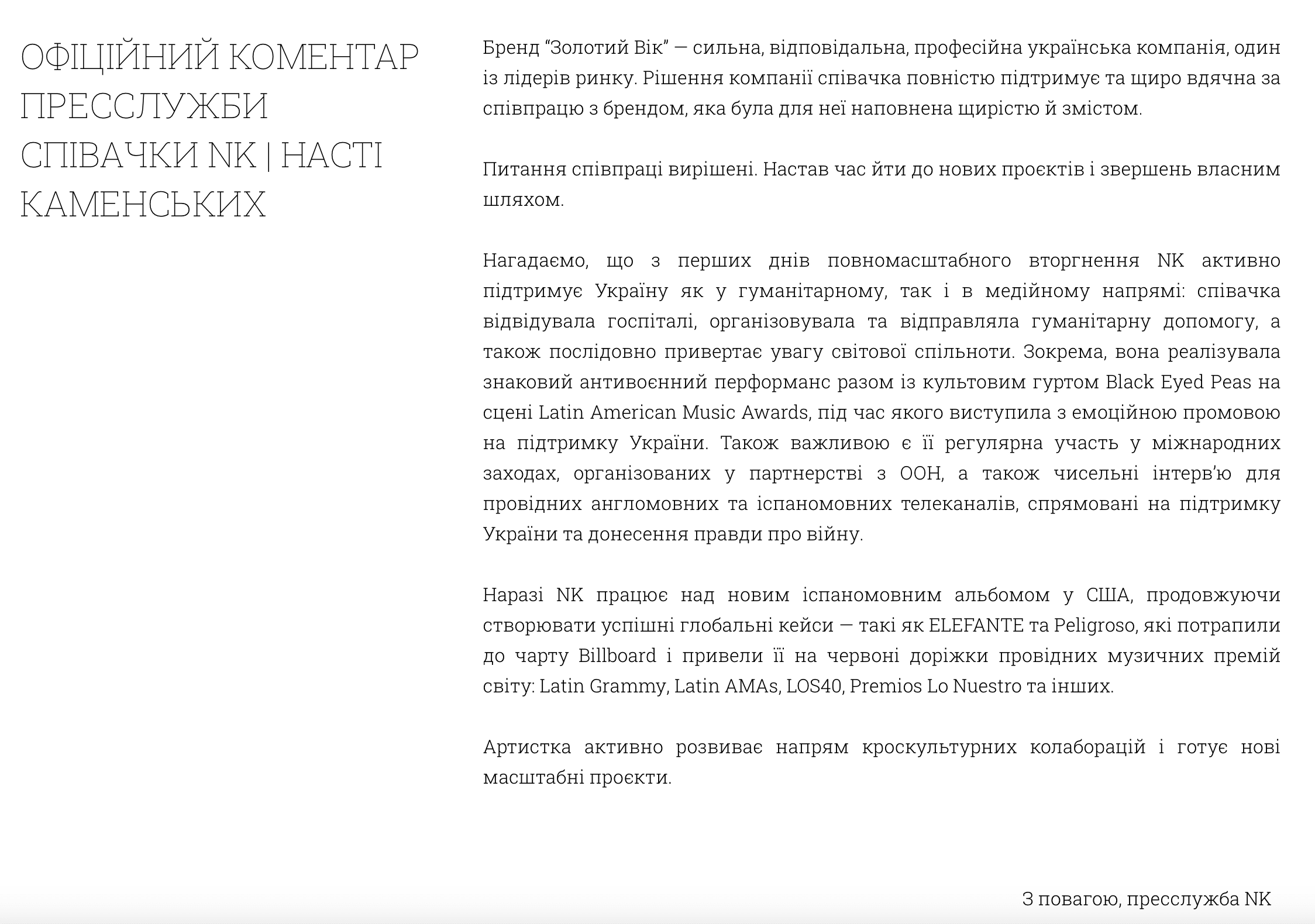 Компанія “Золотий Вік”, обличчям якої зірка була з 2021 року, відмовилася від контракту через неоднозначні виступи співачки, де вона виконувала пісні російською мовою, попри публічні обіцянки відмовитися від цього репертуару. Вперше після хвилі критики співачка висловила свою позицію.