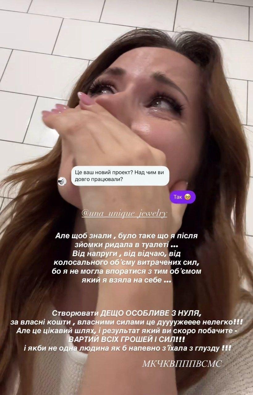 Було таке, що я після знімань ридала в туалеті... Від напруження, відчаю, колосального обʼєму витрачених сил, бо я не могла впоратися з тим обʼємом, який я взяла на себе... Створювати дещо особливе з нуля за власні кошти, власними силами — це дуже нелегко! Але це цікавий шлях, і результат, який ви скоро побачите, вартий всіх грошей і сил! І якби не одна людина, я б, напевно, з'їхала з глузду!