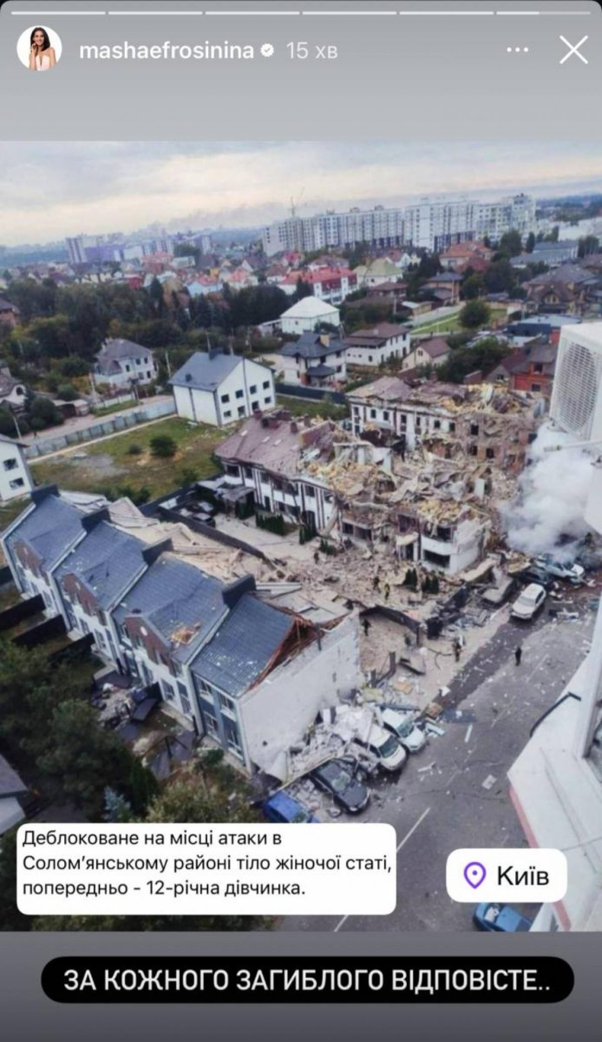 Світлана Тарабарова висловила глибоке співчуття усім постраждалим, опублікувавши у своїх Instagram Stories фотографії знищених вулиць, диму над столицею та вогнеборців, які прийшли на допомогу.