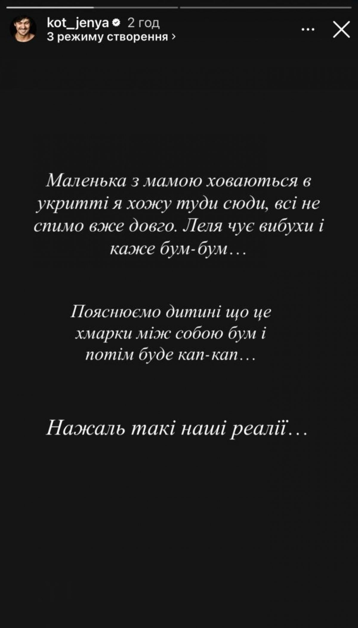 Маленька з мамою ховаються в укритті, я ходжу туди-сюди, всі не спимо вже довго. Леля чує вибухи і каже бум-бум... Пояснюємо дитині, що це хмарки між собою бум і потім буде кап-кап. На жаль, такі наші реалії...,