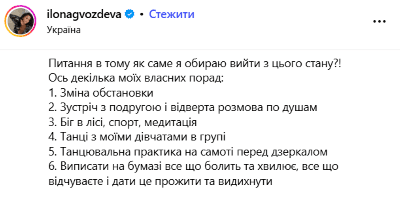 Як каже Гвоздьова, ці поради потрібні не для того, щоби пожаліти себе, а для того, щоб зрозуміти свої емоції та знайти способи допомогти тілу зняти напругу й стрес. Тому для свого емоційного допису вона прикріпила низку фотографій, які чітко демонструють її стан.