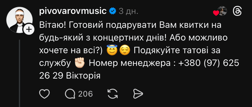 Історія розпочалася після допису мами дівчинки в Threads. Вона розповіла, що донька мріє провести свій день народження 9 листопада на концерті Пивоварова, але не встигла купити квитки, а тато через службу не зможе бути поруч. Допис швидко почали просувати по соцмережі. Що ж зробив Пивоваров — читайте в нас👇!
