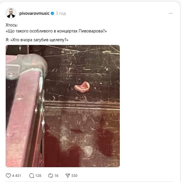Після сьомого концерту Артема Пивоварова в Палаці спорту фанати не стрималися від жартів, коли співак знайшов на підлозі загублену вставну щелепу