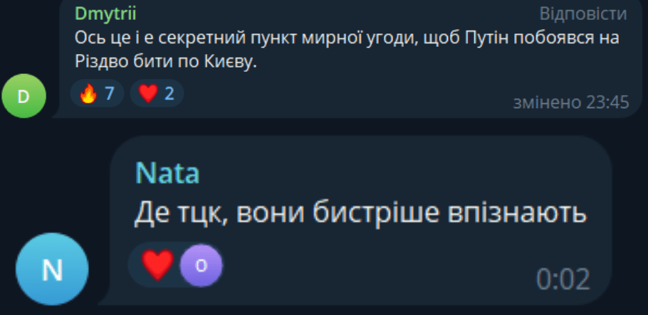 З’являються й коментарі про мирну угоду. Саме так, дехто переконаний, українська влада намагається змусити путіна не обстрілювати міста на Різдво й Новий рік. До того ж не оминули допис і жарти про місцевий ТЦК: