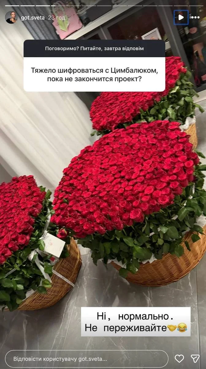 Про реакцію Світлани стало відомо з її Instagram-акаунту, де вона відповіла на запитання підписників у форматі сторіс. Саме там бізнес-вумен опублікувала серію повідомлень із припущеннями про її роман із головним героєм "Холостяка", іронічно зауваживши, що на тлі реальності "Санта-Барбара здасться нецікавою".