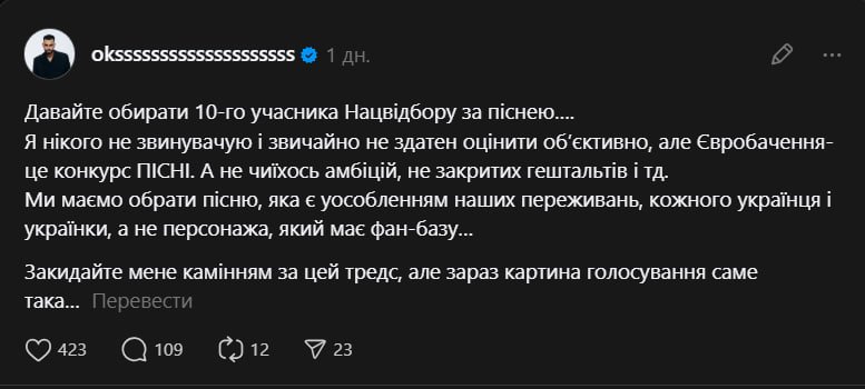 Своє обурення публічно висловив співак Oks, який також претендує на місце у фіналі. Про це артист написав у соцмережах, де поділився власними міркуваннями щодо процесу голосування та наголосив, що для нього Нацвідбір – це передусім конкурс пісень, а не популярності.