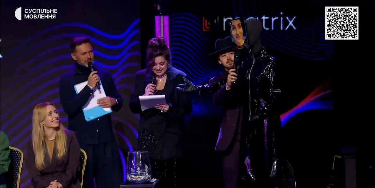 На сцені з’явився манекен у чорному костюмі та шкарпетках, до голови якого був прикріплений планшет із відеозв’язком зі співачкою. Конструкцію сценою пересував чоловік у капелюсі, тримаючи мікрофон, що лише підсилило відчуття театральності моменту.