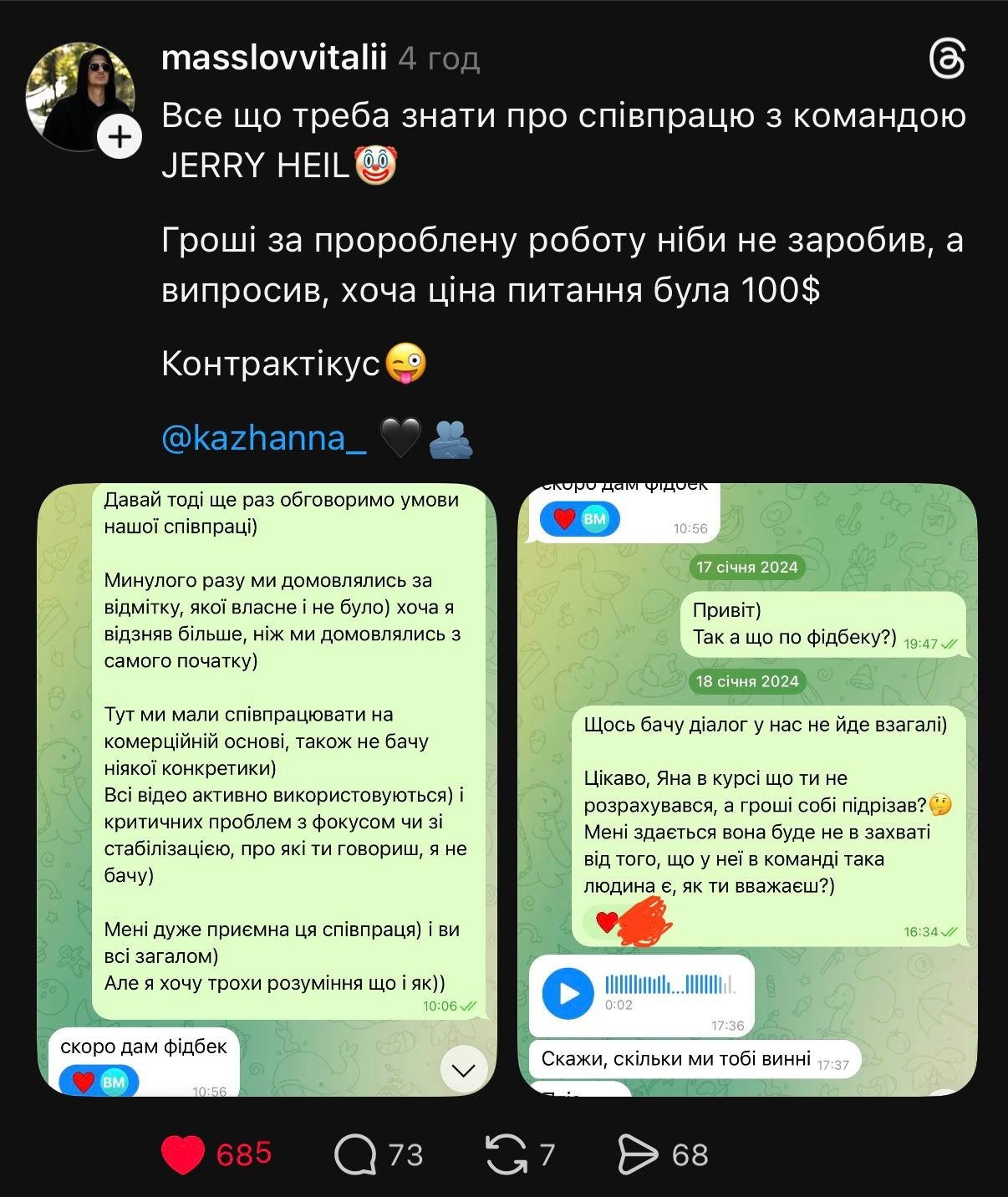У дописі жінка стверджує, що після виконаної роботи відмітку в соцмережах вона так і не отримала. За її словами, з лютого по квітень вона неодноразово намагалася зв’язатися з представниками команди, однак відповіді перестали надходити.