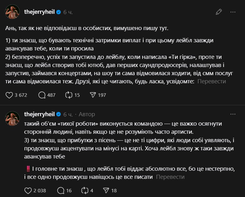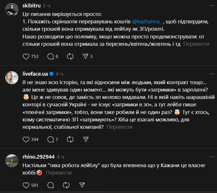 Водночас у публічному просторі з’явилися заклики до прозорості — зокрема, продемонструвати конкретні суми виплат у вигляді скріншотів перерахувань, аби зняти напругу навколо фінансової складової конфлікту. Але є й ті, хто повністю підтримує Джеррі Хейл та її лейбл.