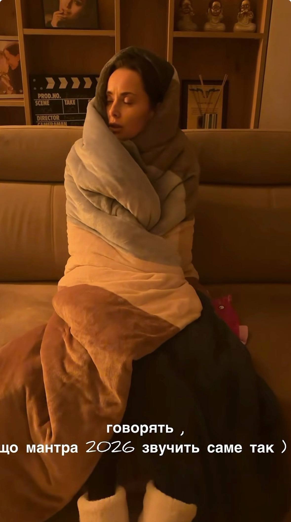 Українська акторка вирішила понуритися в мʼяку атмосферу. Щоб зігріти своє тіло, вона закуталася у велике пухке покривало та взула великі вовняні капці, які нагадують ті самі бурки✨