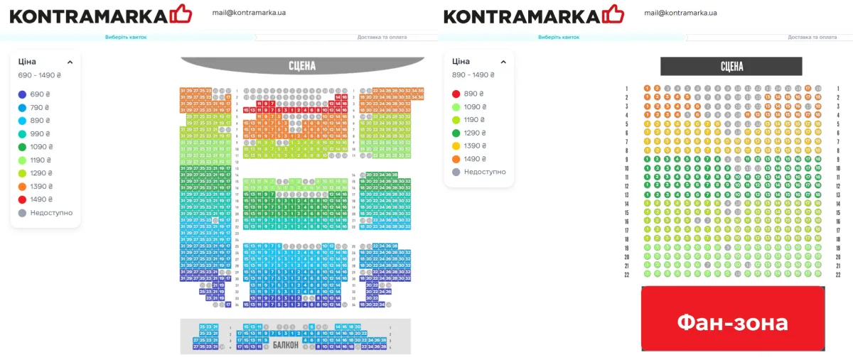 Продані квітки (сірий колір) на концерти Кажанни в Одесі (ліворуч) та Дніпрі (праворуч). Скриншоти: Kontrmarka