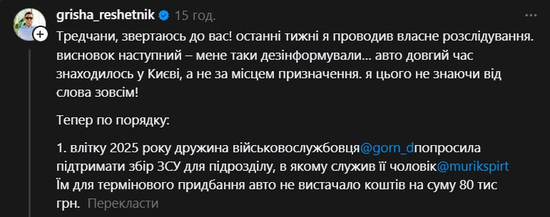 Григорій Решетнік про скандал з авто. Скрин: Threads
